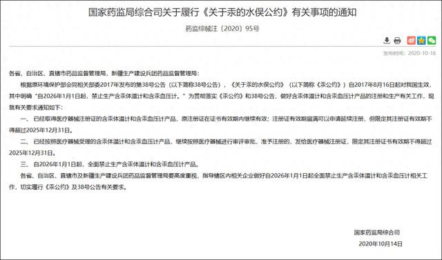 根据国家药监局综合司关于履行《关于汞的水俣公约》有关事项的通知,自2026年1月1日起,禁止生产含汞体温计和含汞血压计。通知要求: